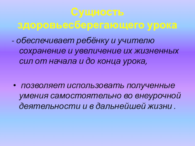 Слайд 13Сущность здоровьесберегающего урока
