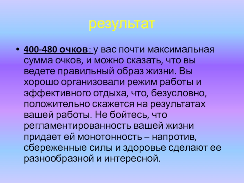 что вы ведете правильный образ жизни. Вы хорошо организовали режим работы и эффективного отдыха, что, безусловно, положительно скажется на результатах вашей работы. Не бойтесь, что регламентированность вашей жизни придает ей монотонность – напротив, сбереженные силы и здоровье сделают ее разнообразной и интересной.