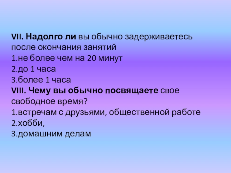 Слайд 51VII. Надолго ли вы обычно задерживаетесь после окончания занятий