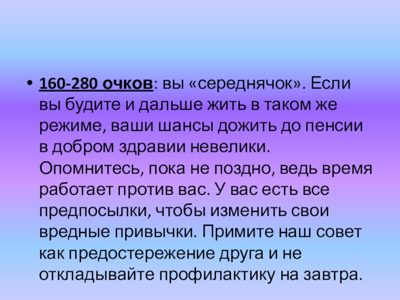 Слайд 58160-280 очков: вы «середнячок». Если вы будите и дальше жить в