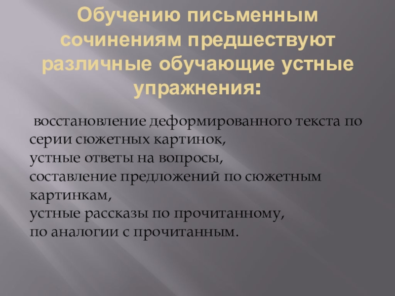 Обучению письменным сочинениям предшествуют различные обучающие устные упражнения: