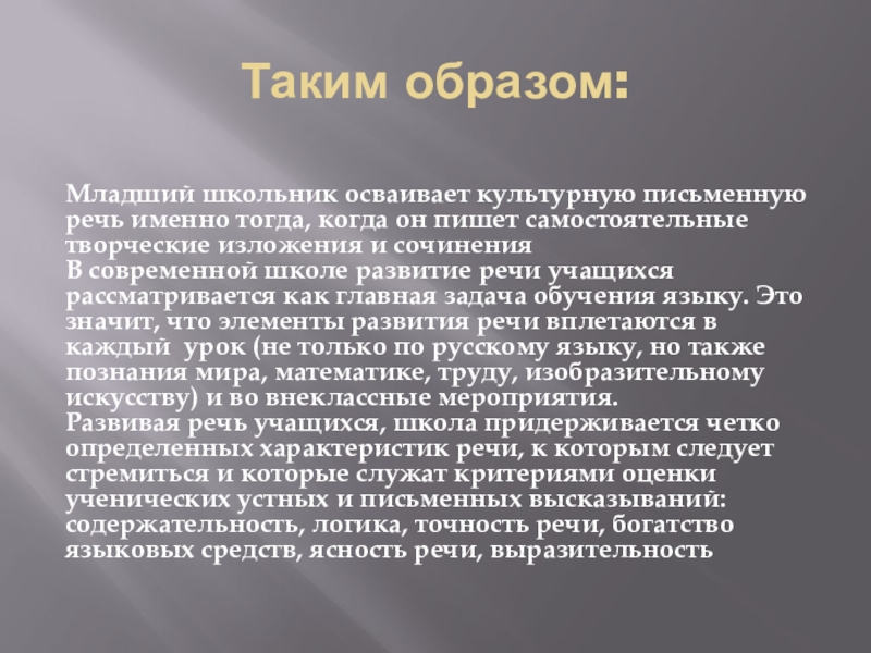 Развивая речь учащихся, школа придерживается четко определенных характеристик речи, к которым следует стремиться и которые служат критериями оценки ученических устных и письменных высказываний: содержательность, логика, точность речи, богатство языковых средств, ясность речи, выразительность
