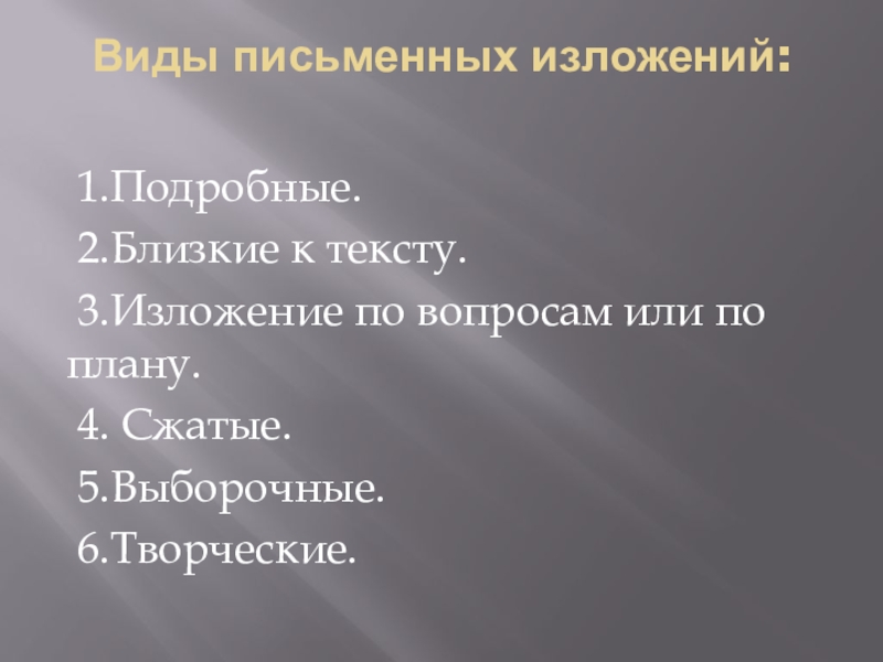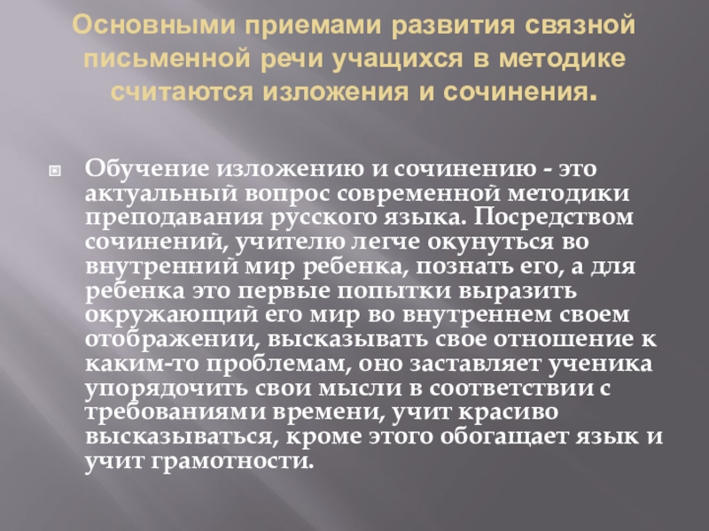 Слайд 9Основными приемами развития связной письменной речи учащихся в методике считаются изложения