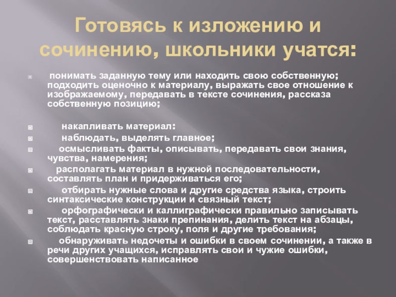 обнаруживать недочеты и ошибки в своем сочинении, а также в речи других учащихся, исправлять свои и чужие ошибки, совершенствовать написанное
