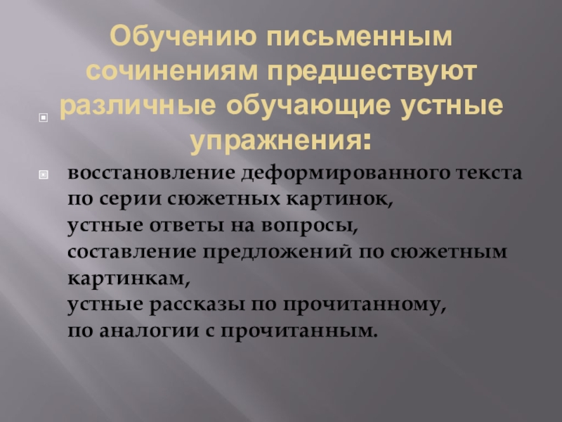 Слайд 8Обучению письменным сочинениям предшествуют различные обучающие устные упражнения: