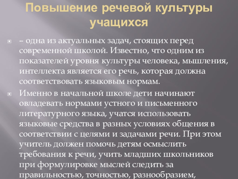 современной школой. Известно, что одним из показателей уровня культуры человека, мышления, интеллекта является его речь, которая должна соответствовать языковым нормам.