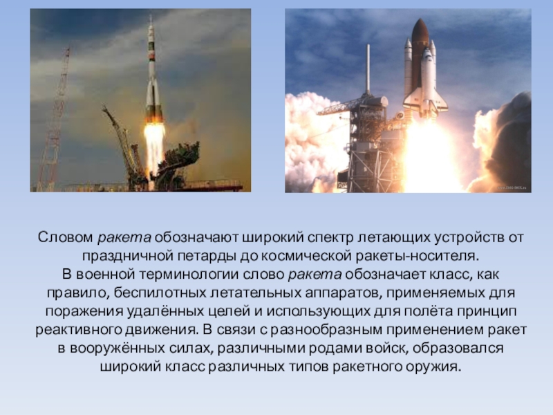 реактивной тяги, возникающей только вследствие отброса части собственной массы (рабочего тела) аппарата и без использования вещества из окружающей среды. Поскольку полёт ракеты не требует обязательного наличия окружающей воздушной или газовой среды, то он возможен не только в атмосфере, но и в вакууме