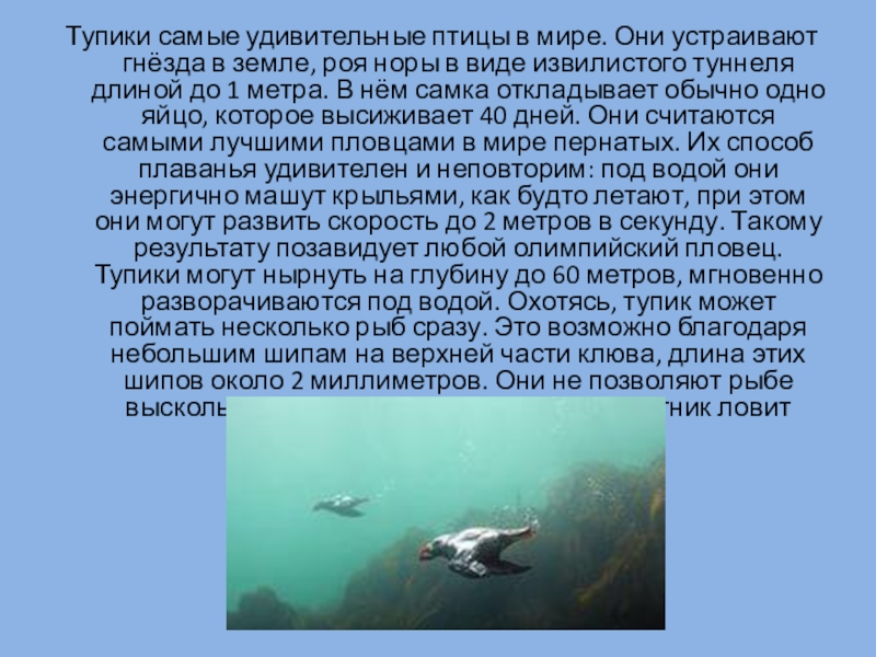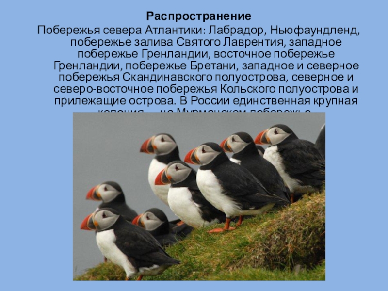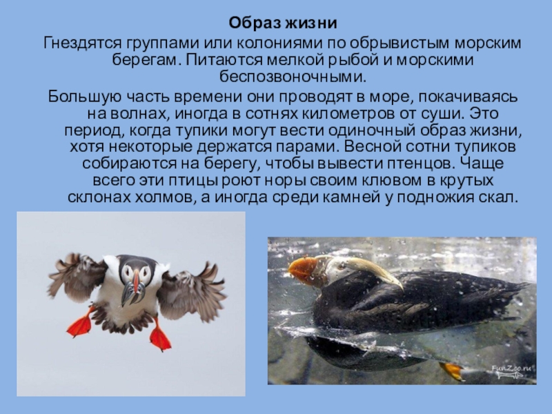 с боков. Спина чёрная, низ тела белый. Лапы оранжево-красные. Тупики хорошо ходят, летают, плавают и ныряют, используя крылья и лапы.