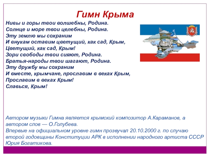 Автором музыки Гимна является крымский композитор А.Караманов, а автором слов — О.Голубева.
