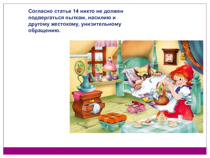 Слайд 12Согласно статье 14 никто не должен подвергаться пыткам, насилию и другому