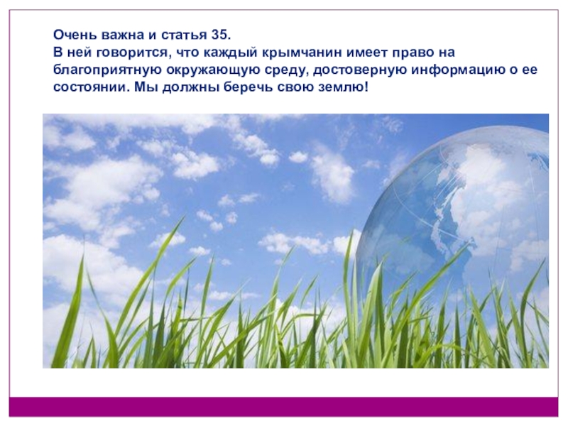 имеет право на благоприятную окружающую среду, достоверную информацию о ее состоянии. Мы должны беречь свою землю!