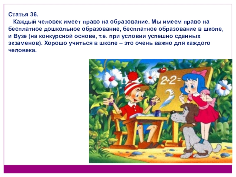 право на образование. Мы имеем право на бесплатное дошкольное образование, бесплатное образование в школе, и Вузе (на конкурсной основе, т.е. при условии успешно сданных экзаменов). Хорошо учиться в школе – это очень важно для каждого человека.