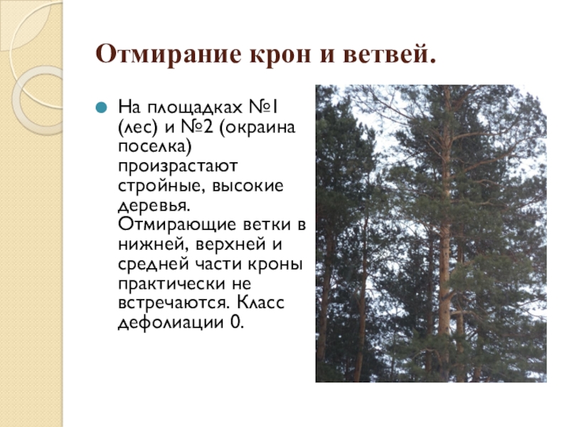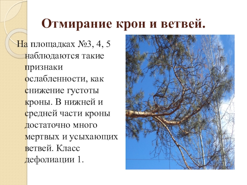 Изучить влияние загрязнения воздуха на отмирание крон и ветвей (дефолиацию)