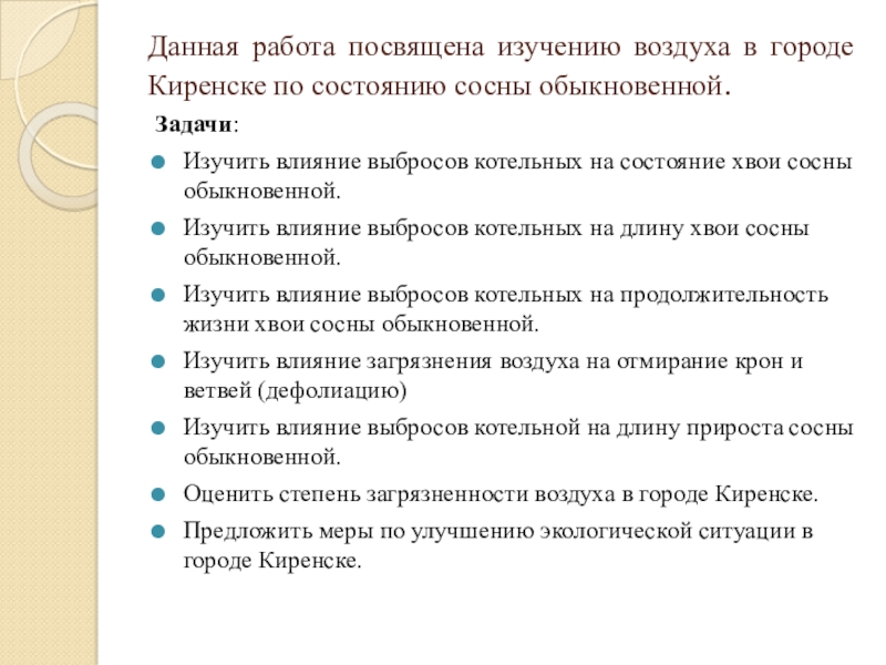 Изучить влияние выбросов котельных на длину хвои сосны обыкновенной.
