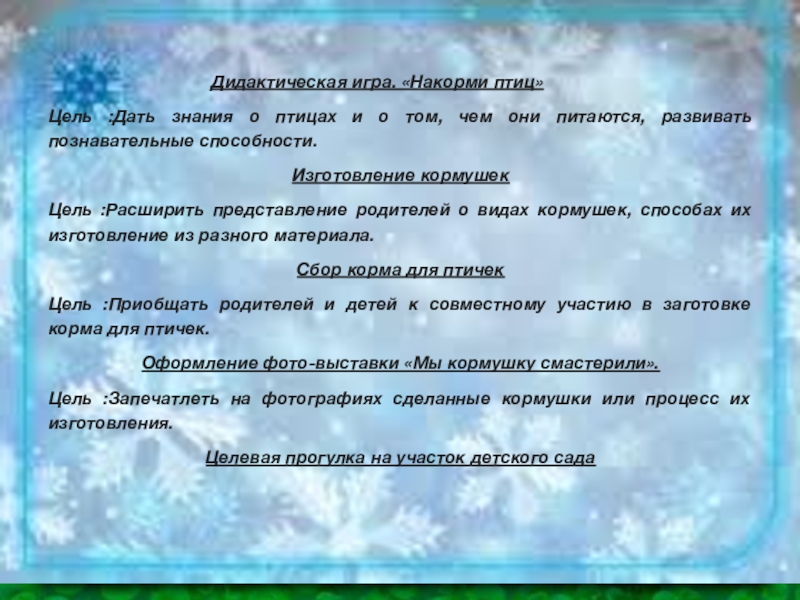 Цель :Закреплять знания детей о зимних явлениях природы. Показать детям кормушку для птиц. Формировать желание подкармливать птиц зимой. Расширять представления о зимующих птицах.
