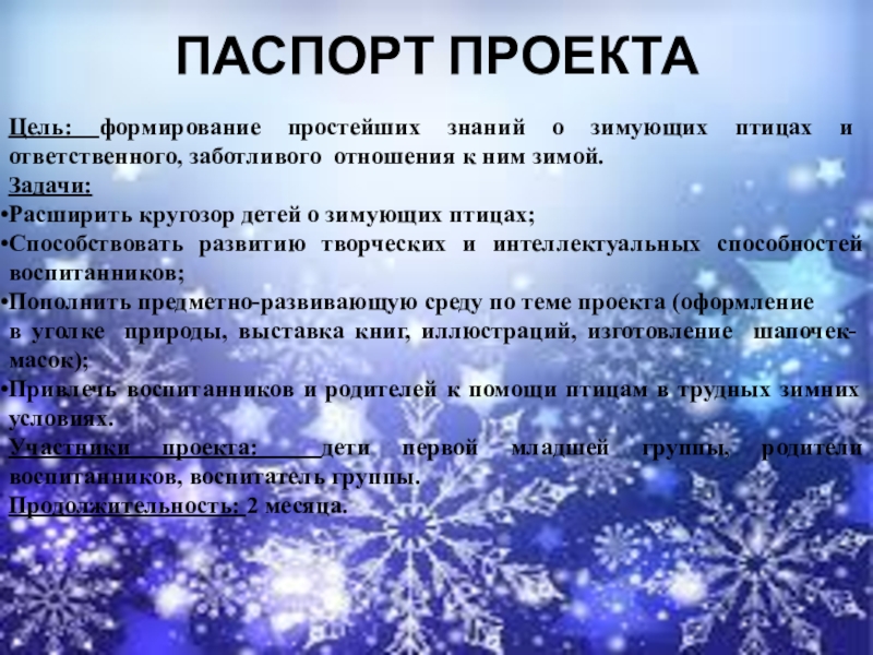 ПАСПОРТ ПРОЕКТАЦель: формирование простейших знаний о зимующих птицах и ответственного, заботливого отношения к ним зимой. Задачи: Расширить