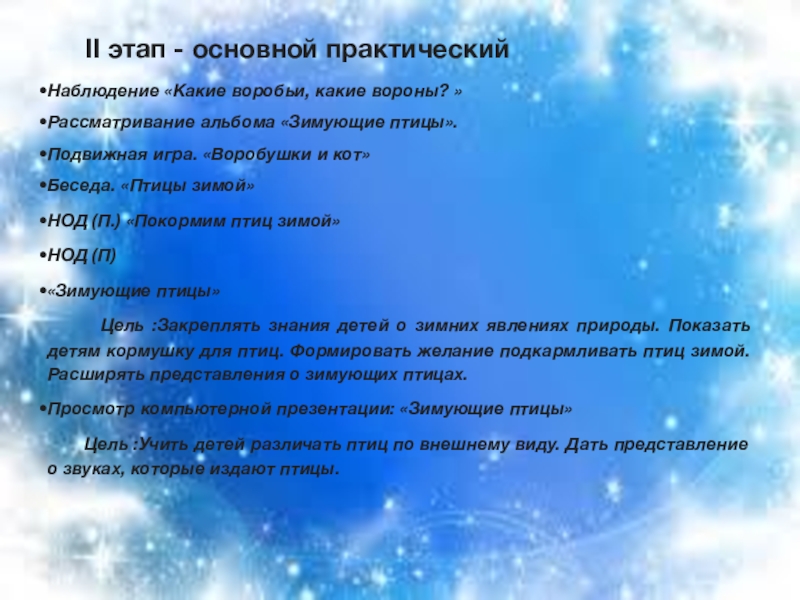 II этап - основной практическийНаблюдение «Какие воробьи, какие вороны? »Рассматривание альбома «Зимующие птицы».Подвижная игра. «Воробушки и