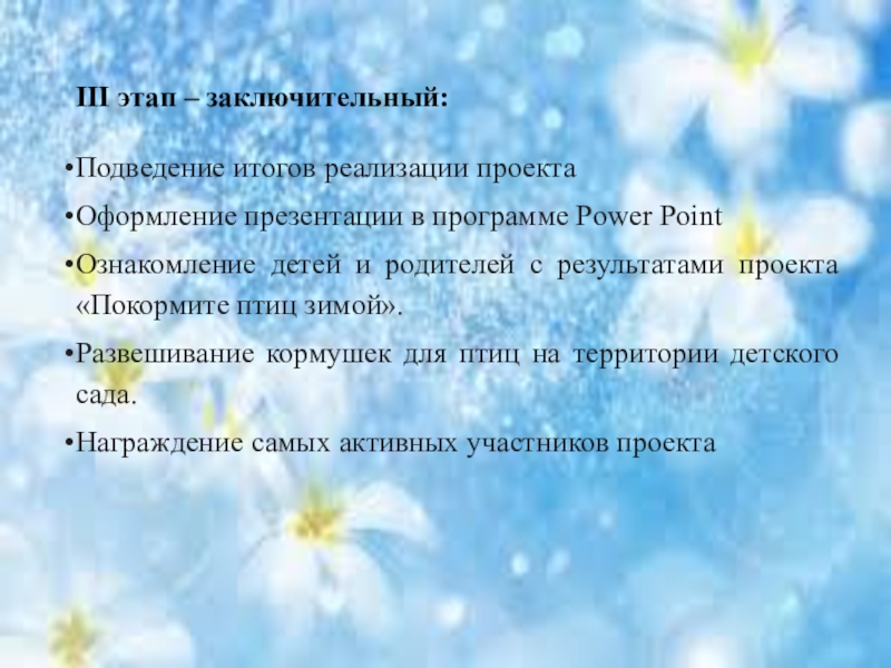 III этап – заключительный:Подведение итогов реализации проектаОформление презентации в программе Power PointОзнакомление детей и родителей с результатами