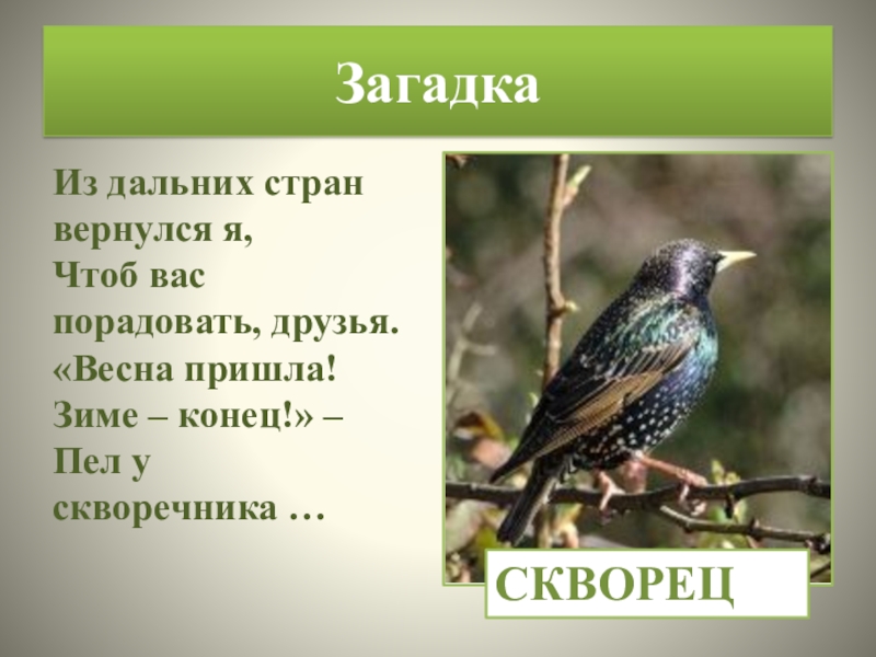ЗагадкаИз дальних стран вернулся я, Чтоб вас порадовать, друзья. «Весна пришла! Зиме – конец!» –  Пел у