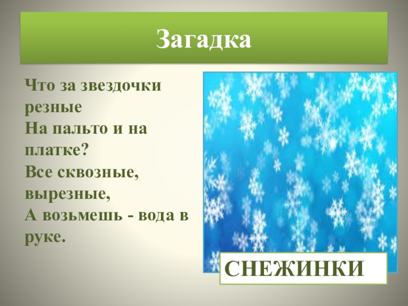 ЗагадкаЧто за звездочки резные На пальто и на платке? Все сквозные, вырезные, А возьмешь - вода в