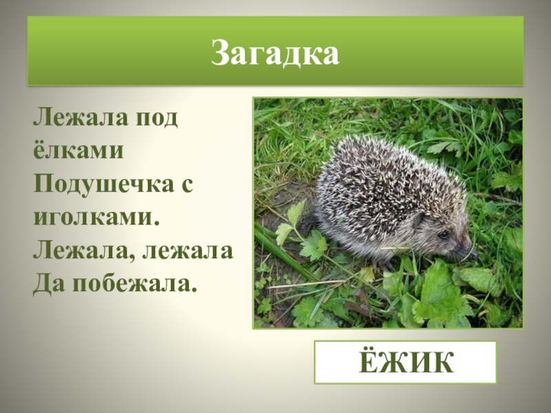 ЗагадкаЛежала под ёлками Подушечка с иголками. Лежала, лежала Да побежала.   ЁЖИК