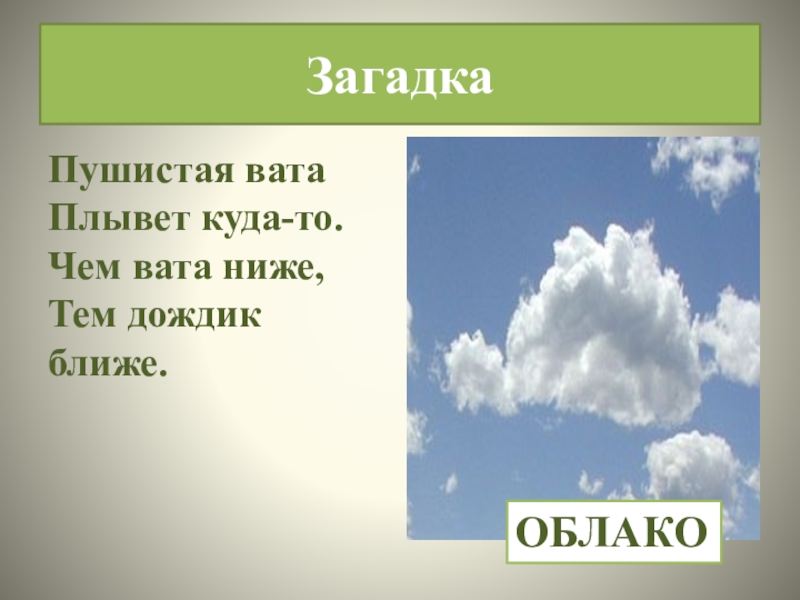ЗагадкаПушистая вата Плывет куда-то. Чем вата ниже, Тем дождик ближе.ОБЛАКО