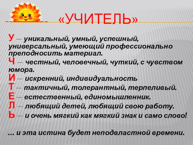 У — уникальный, умный, успешный, универсальный, умеющий профессионально преподносить материал.