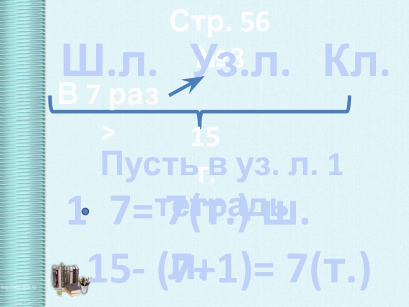 Стр. 56 №8Ш.л.  Уз.л.  Кл.15 т.В 7 раз >1 7= 7(т.) ш.л.Пусть в уз. л.