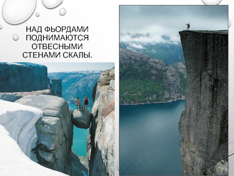 Слайд 4НАД ФЬОРДАМИ ПОДНИМАЮТСЯ ОТВЕСНЫМИ СТЕНАМИ СКАЛЫ.