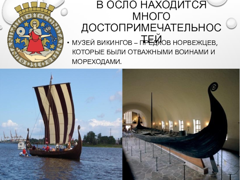 В ОСЛО НАХОДИТСЯ МНОГО ДОСТОПРИМЕЧАТЕЛЬНОСТЕЙМУЗЕЙ ВИКИНГОВ – ПРЕДКОВ НОРВЕЖЦЕВ, КОТОРЫЕ БЫЛИ ОТВАЖНЫМИ ВОИНАМИ И МОРЕХОДАМИ.