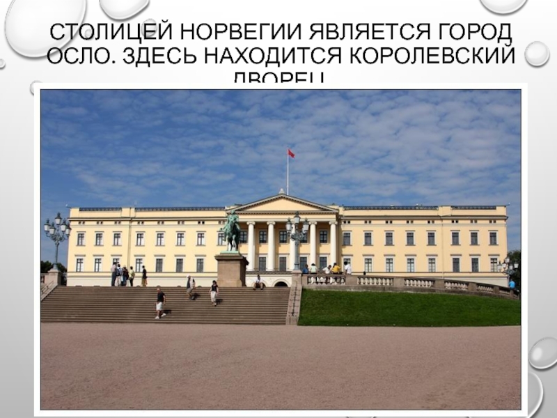 СТОЛИЦЕЙ НОРВЕГИИ ЯВЛЯЕТСЯ ГОРОД ОСЛО. ЗДЕСЬ НАХОДИТСЯ КОРОЛЕВСКИЙ ДВОРЕЦ.