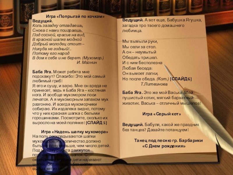 Ведущий. А вот еще, Бабушка Ягушка, загадка про твоего домашнего любимца.