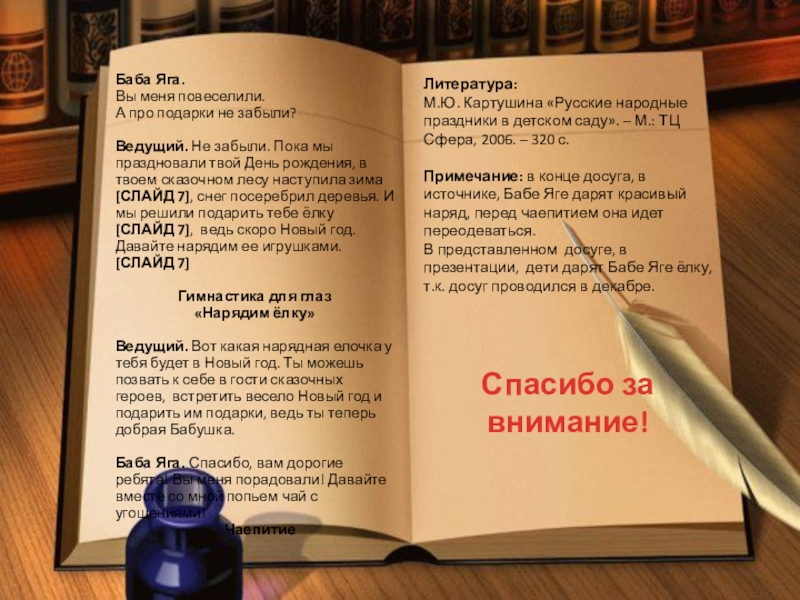 В представленном досуге, в презентации, дети дарят Бабе Яге ёлку, т.к. досуг проводился в декабре.