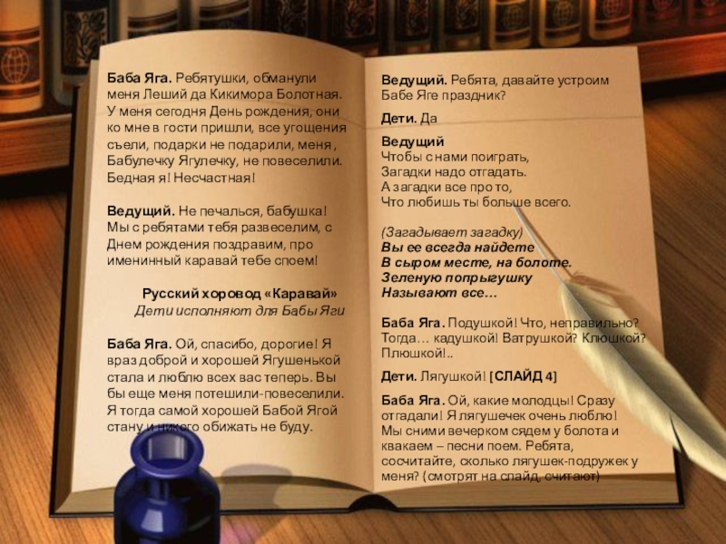 Баба Яга. Ой, какие молодцы! Сразу отгадали! Я лягушечек очень люблю!
