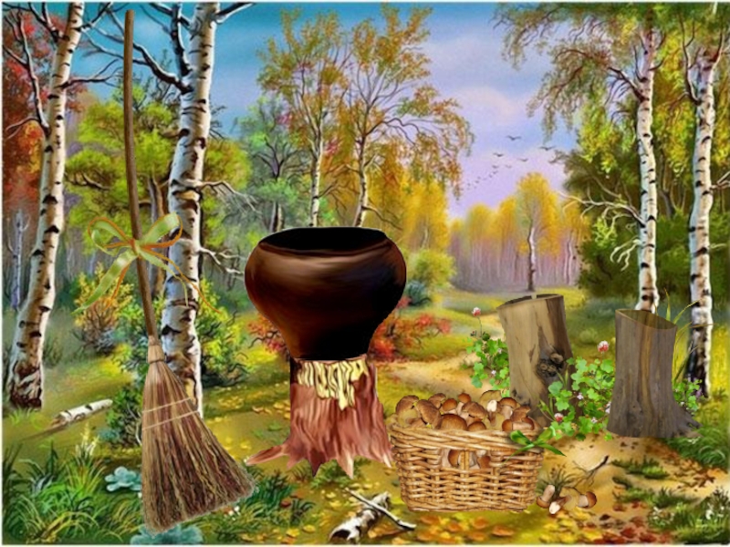 в сказочном лесу. [СЛАЙД 3] Ой, а что же это за поляна, котелок пустой на ней стоит, метла? Давайте подойдем поближе и посмотрим, кто там живет!