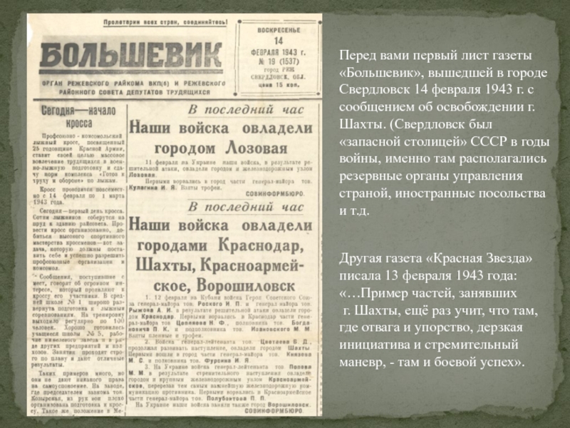 Другая газета «Красная Звезда» писала 13 февраля 1943 года: «…Пример частей, занявших