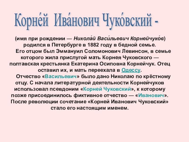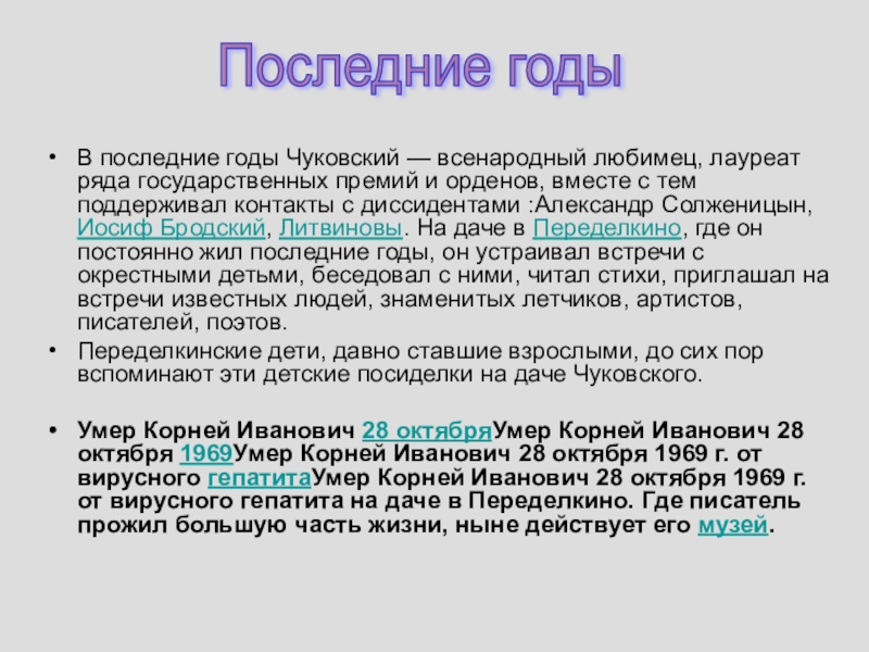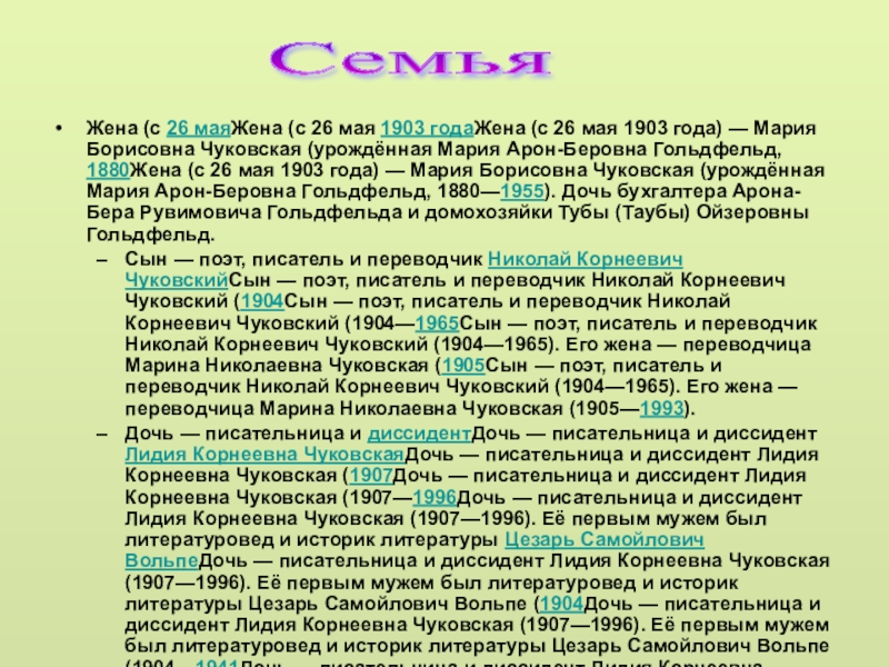 Дочь — писательница и диссидентДочь — писательница и диссидент Лидия Корнеевна ЧуковскаяДочь — писательница и диссидент Лидия Корнеевна Чуковская (1907Дочь — писательница и диссидент Лидия Корнеевна Чуковская (1907—1996Дочь — писательница и диссидент Лидия Корнеевна Чуковская (1907—1996). Её первым мужем был литературовед и историк литературы Цезарь Самойлович ВольпеДочь — писательница и диссидент Лидия Корнеевна Чуковская (1907—1996). Её первым мужем был литературовед и историк литературы Цезарь Самойлович Вольпе (1904Дочь — писательница и диссидент Лидия Корнеевна Чуковская (1907—1996). Её первым мужем был литературовед и историк литературы Цезарь Самойлович Вольпе (1904—1941Дочь — писательница и диссидент Лидия Корнеевна Чуковская (1907—1996). Её первым мужем был литературовед и историк литературы Цезарь Самойлович Вольпе (1904—1941), вторым — физик и популяризатор науки Матвей Петрович БронштейнДочь — писательница и диссидент Лидия Корнеевна Чуковская (1907—1996). Её первым мужем был литературовед и историк литературы Цезарь Самойлович Вольпе (1904—1941), вторым — физик и популяризатор науки Матвей Петрович Бронштейн (1906Дочь — писательница и диссидент Лидия Корнеевна Чуковская (1907—1996). Её первым мужем был литературовед и историк литературы Цезарь Самойлович Вольпе (1904—1941), вторым — физик и популяризатор науки Матвей Петрович Бронштейн (1906—1938).
