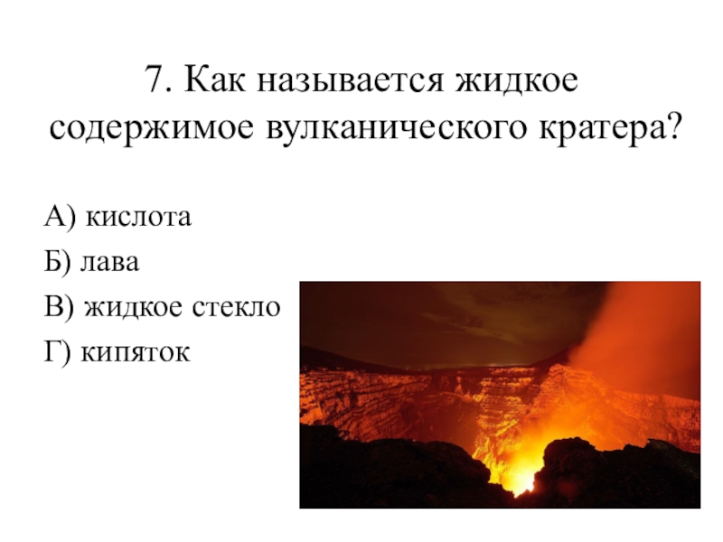 7. Как называется жидкое содержимое вулканического кратера? А) кислота Б) лава В) жидкое стекло Г) кипяток