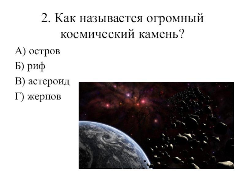 2. Как называется огромный космический камень? А) остров Б) риф В) астероид Г) жернов