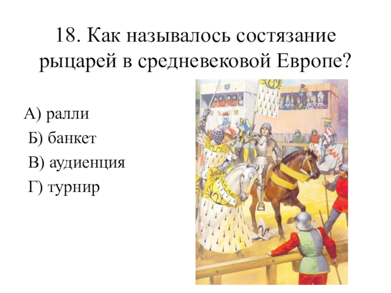 18. Как называлось состязание рыцарей в средневековой Европе? А) ралли  Б) банкет  В) аудиенция Г)