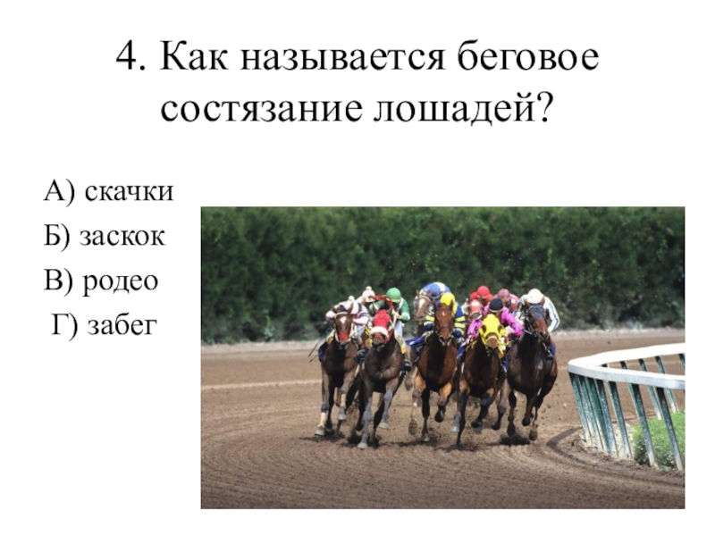 4. Как называется беговое состязание лошадей? А) скачки Б) заскок В) родео Г) забег