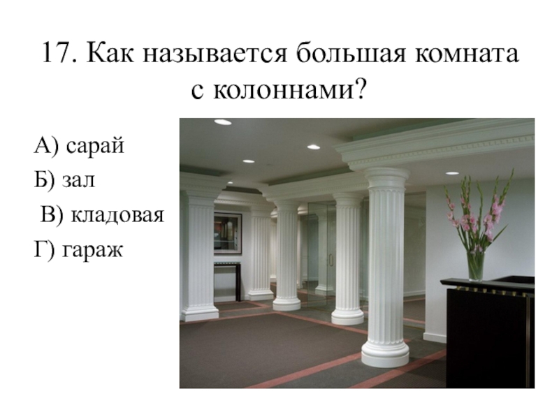 17. Как называется большая комната с колоннами? А) сарай  Б) зал  В) кладовая  Г)