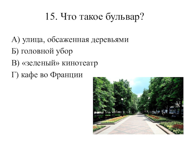 15. Что такое бульвар? А) улица, обсаженная деревьями Б) головной убор В) «зеленый» кинотеатр Г) кафе во