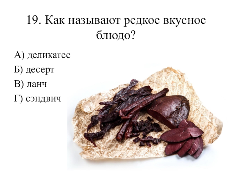 19. Как называют редкое вкусное блюдо? А) деликатес Б) десерт В) ланч  Г) сэндвич