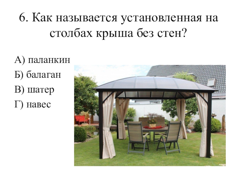 6. Как называется установленная на столбах крыша без стен? А) паланкин Б) балаган В) шатер Г) навес