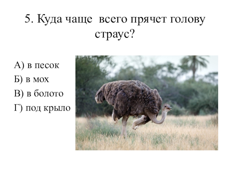 5. Куда чаще всего прячет голову страус? А) в песок Б) в мох В) в болото Г)