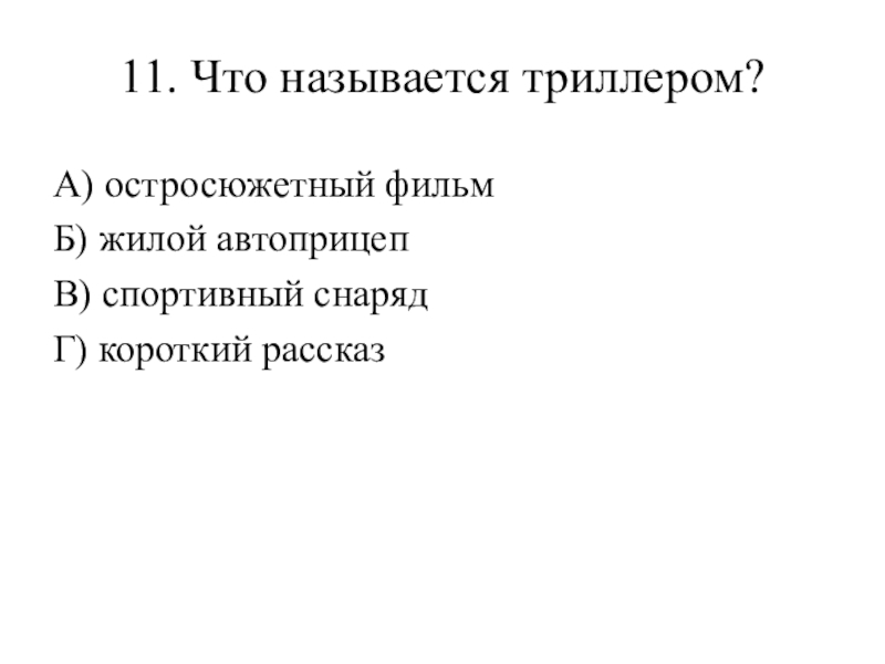 11. Что называется триллером? А) остросюжетный фильм Б) жилой автоприцеп В) спортивный снаряд Г) короткий рассказ