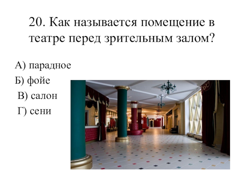 Слайд 2120. Как называется помещение в театре перед зрительным залом?