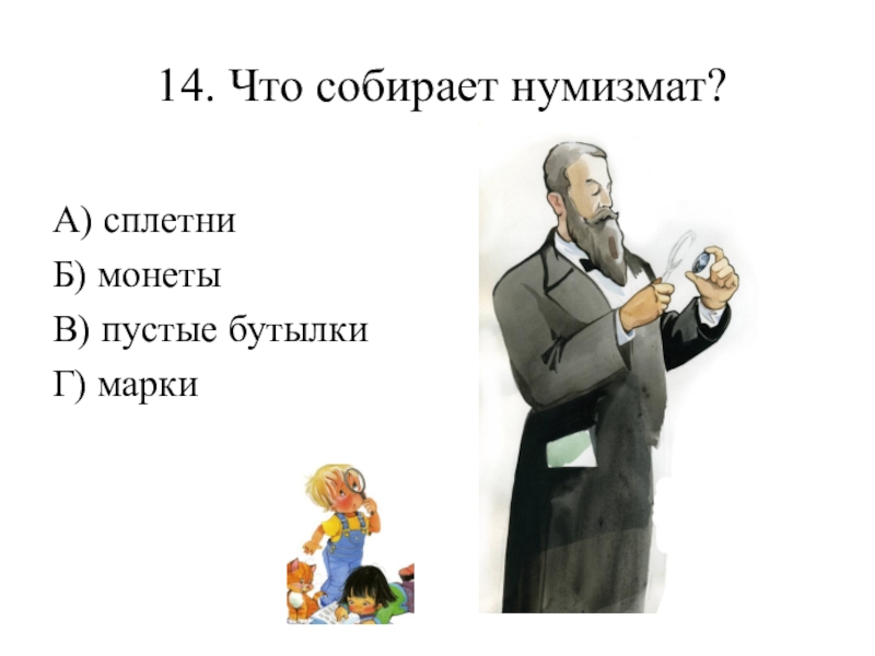 14. Что собирает нумизмат? А) сплетни Б) монеты В) пустые бутылки Г) марки