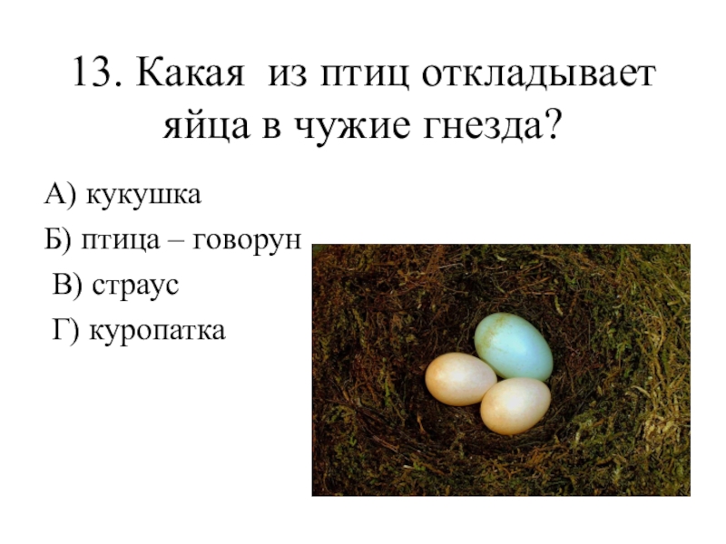 13. Какая из птиц откладывает яйца в чужие гнезда?А) кукушка Б) птица – говорун В) страус Г)